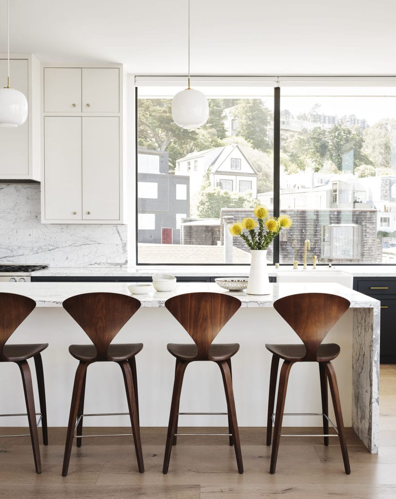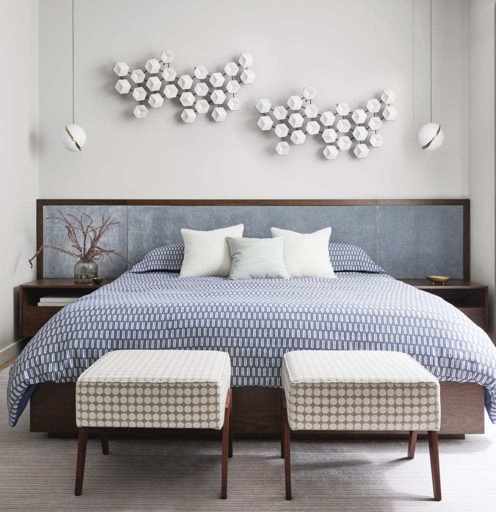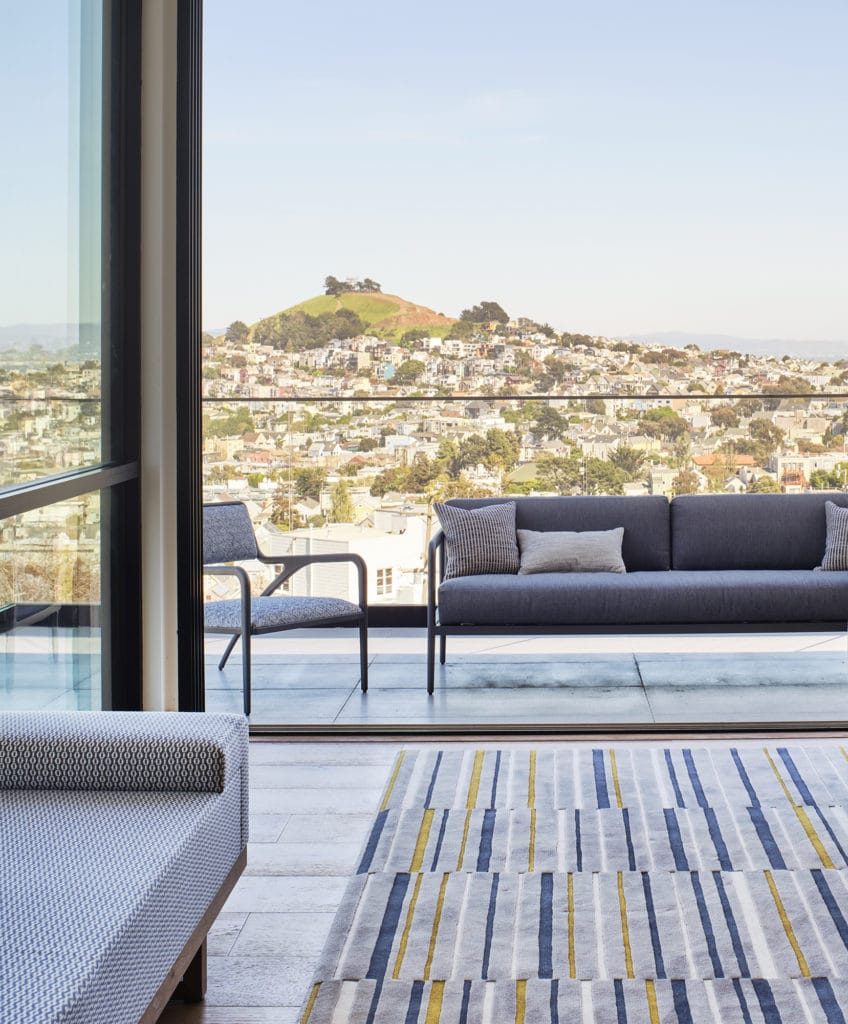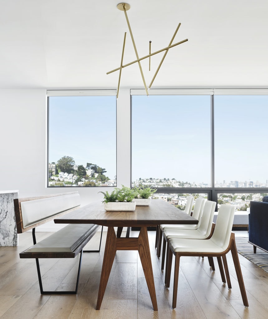 Our San Francisco clients asked for a kid and pet-friendly home with a focus on eco-friendly design choices, modern furniture and non-toxic finishes. We incorporated their love of mid-century interior design throughout the home, with a mix of custom furniture, playful patterns, and modern lighting. The panoramic views of San Francisco take center stage in the living/dining room where our interior designers oriented the furniture to take advantage of the views. A custom, eco-friendly sectional grounds the living room with a mod swivel chair and colorful rug. We maximized seating and planned for durability in the dining area which features wipeable seating and a custom walnut dining table made by a local Bay Area fabricator. Niche Interiors designed a low slung bed in the primary bedroom for a sophisticated, bespoke vibe. Statement pendant lights and subtle pops of pattern complete the space. We amped up the color in the media room with a graphic, peacock blue rug and pops of kelly green. A custom sectional provides plenty of seating for movie and game nights.